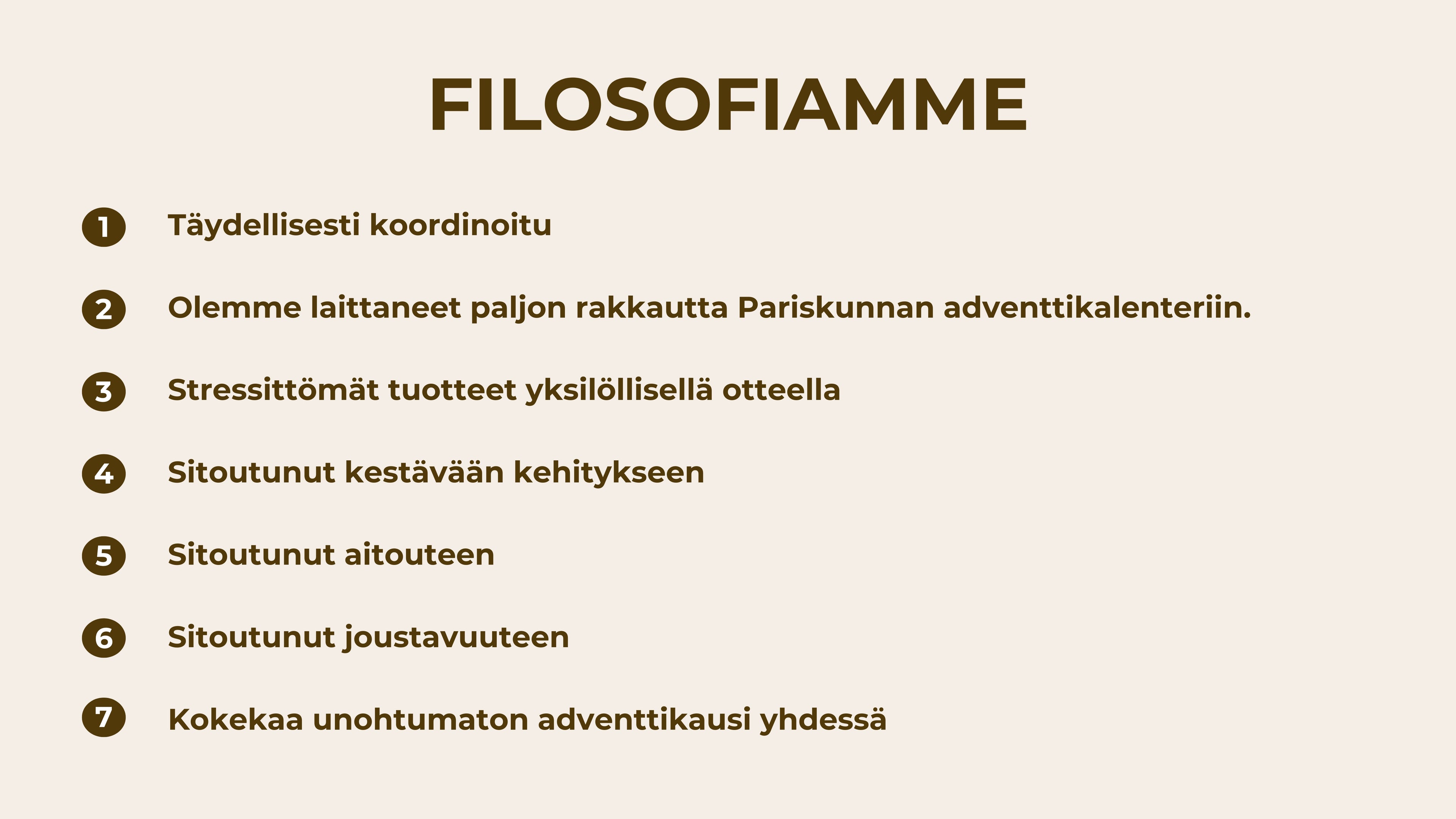 Olemme Leevi, Sofia, Maria ja Niko – olemme kaksi pariskuntaa, jotka ovat olleet läheisiä ystäviä jo monen vuoden ajan. Ystävyyttämme leimaavat yhteiset kokemukset ja rakastavat perinteet, joihin kuuluu myös adventtikalenterien tekeminen kumppaneillemme. Joka vuosi käytämme paljon aikaa ja vaivaa luodaksemme ainutlaatuisia adventtikalentereita, jotka ovat täynnä käsinkirjoitettuja kirjeitä, helliä kortteja, pieniä lahjoja ja paljon muuta. Nämä kalenterit toivat kumppaneillemme paljon iloa ja tekivät joulua edeltävästä ajasta jotain aivan erityistä. Mutta niin kaunis kuin tämä perinne olikin, se vaati aina paljon työtä. Kalenterien tekeminen oli paitsi aikaa vievää myös kallista. Heräsi myös kysymys: miksi vain yhden ihmisen pitäisi saada adventtikalenterin ilo ja yllätykset? Tämä jaettu kokemus voisi tehdä tästä vuodenajasta entistäkin erityisemmän ja auttaa teitä sitoutumaan toisiinne entistäkin enemmän, joten löysimme ratkaisun. Loimme adventtikalenterin, joka on stressitön ja edullinen sekä tuo iloa molemmille osapuolille ja lähentää heitä.
